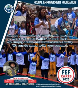 The Frugal Foundation was established fundamentally on the premise of reducing the alarming level poverty, hunger and deprivation that has infested our economic landscape or society. It sought to give hope to the hapless talented youths in our mists, to support them to actualize their vision. That is, the unsung potential heroes of talented youths who operate from economic disadvantaged background. This Foundation wants to affect their lives by supporting and encouraging them to be a success story in the environment they otherwise considered impossible to make a difference in their lives. The Foundation is poised in redefining their perceptions, purpose, and prospects by giving them the needed support to succeed.