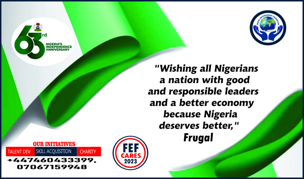 On the occasion of Nigeria’s 63rd Independence Anniversary, the Frugal Empowerment Foundation extends heartfelt wishes to the resilient and diverse