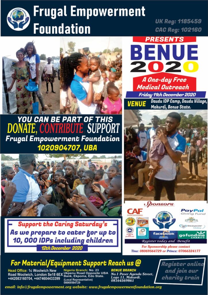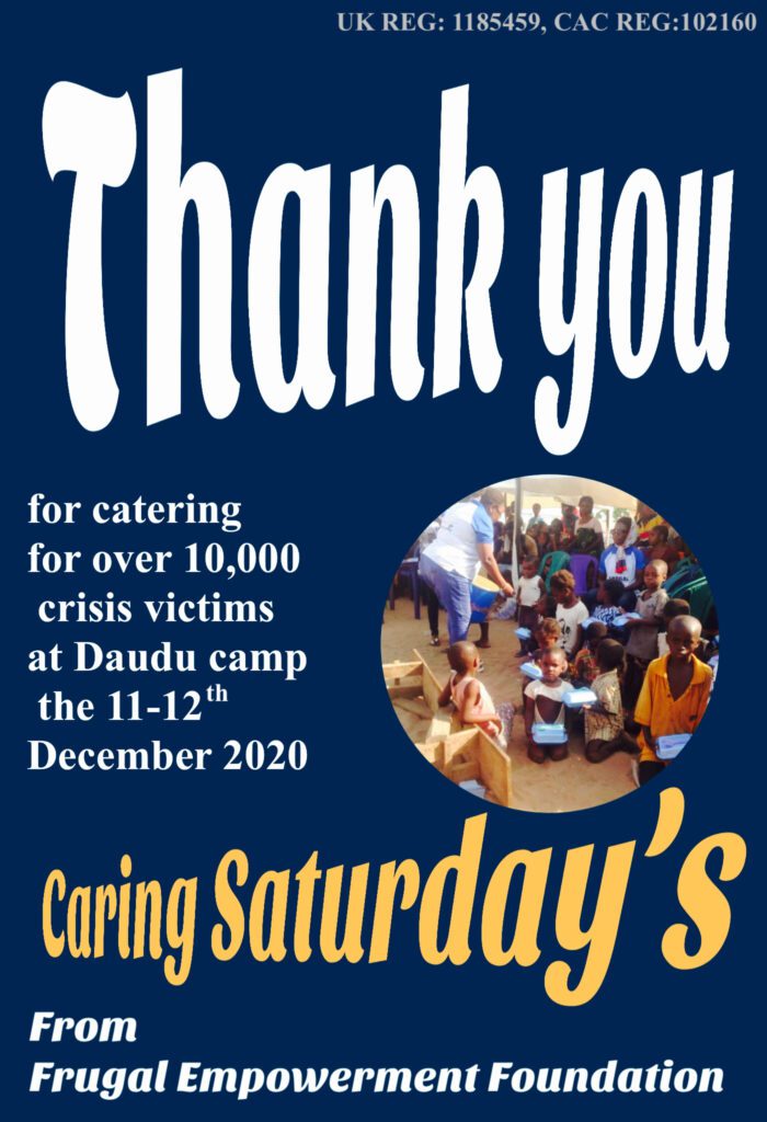 coming up: Lives savers event “Caring Saturday’s. Over 10,000 less privileged, including children, widows and Internally Displaced Persons at Daudu Village, Makurdi, Benue State, will be catered for this December 11-12th December 2020