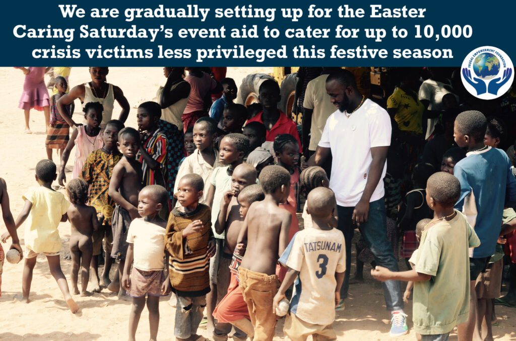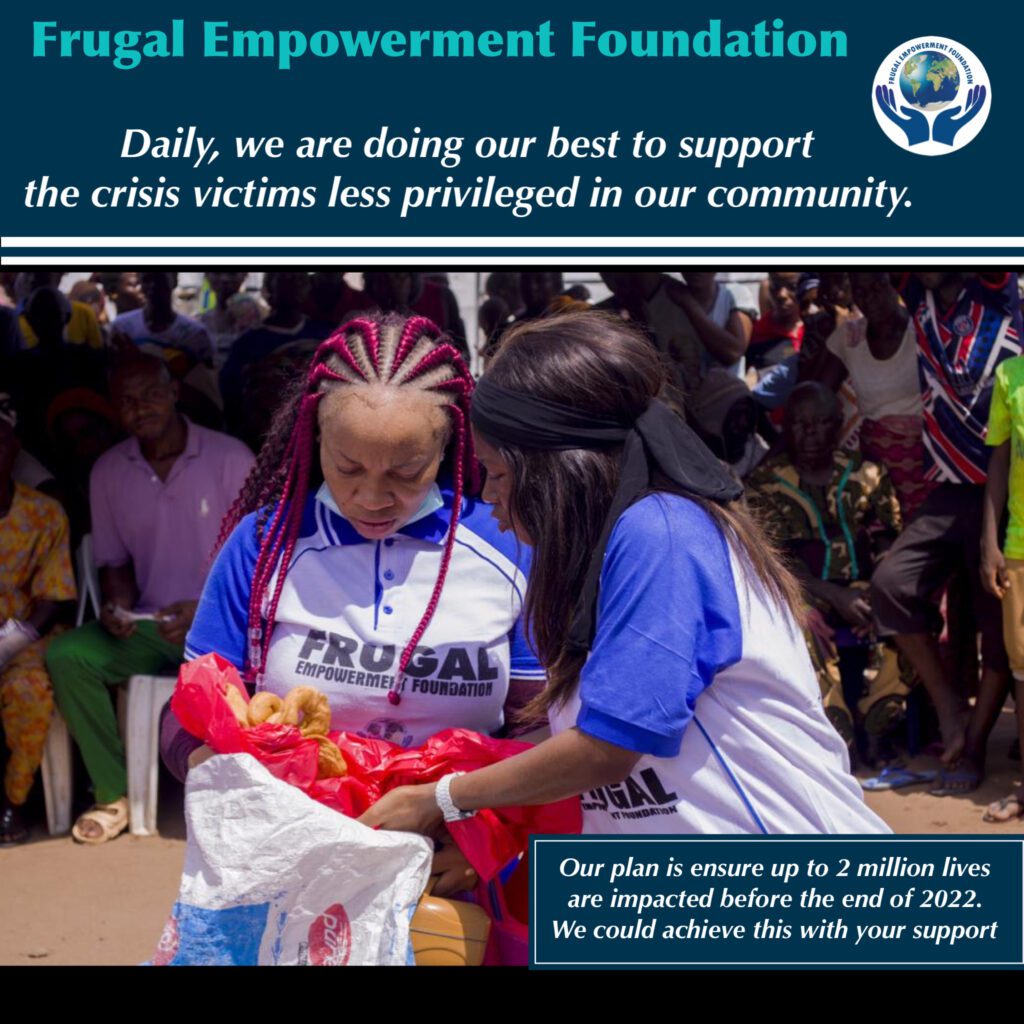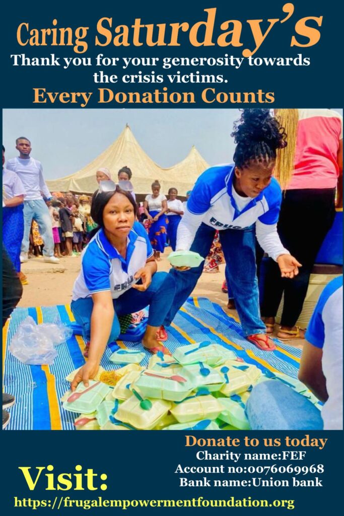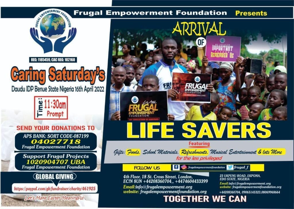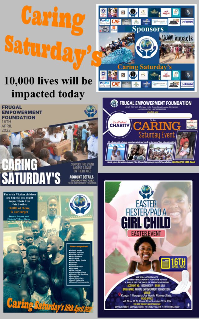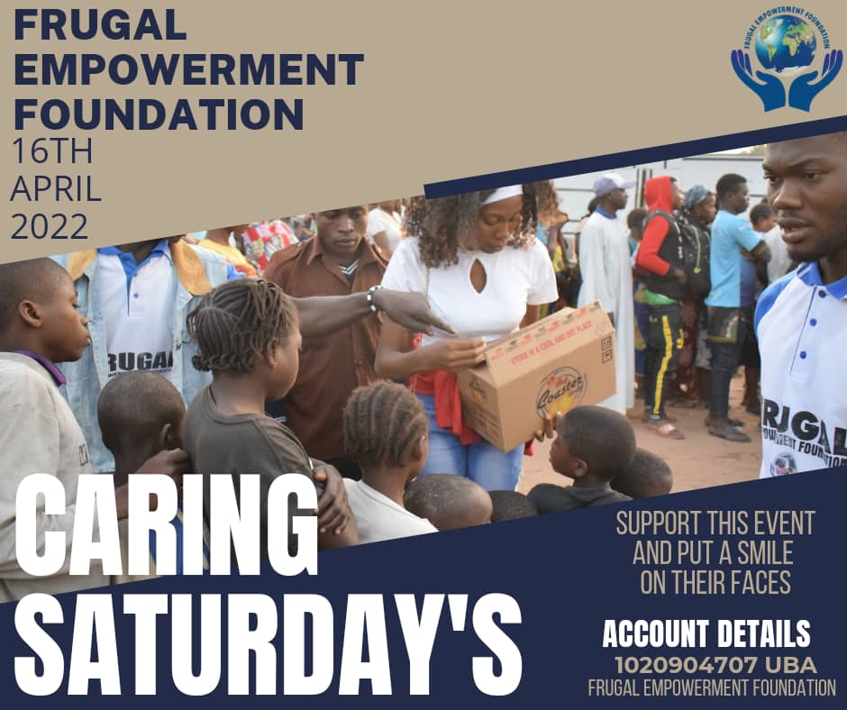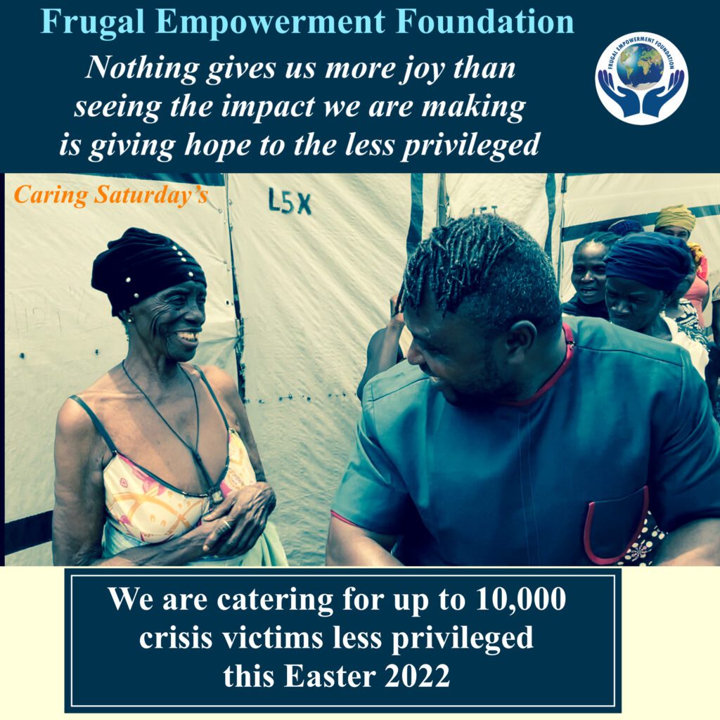 Yes! You can help make a difference this Easter. Over 10,000 less privilege crisis victims will be impacted through this project in 4 days time For those who have donated so far, we are grateful. Please do not forget to send your oganization details for promotion purposes. Only at Frugal Empowerment FoundationWill you save a child’s life this Easter? Thank you From Frugal Empowerment Foundation6 more days to go. A season to test our faith once again, this Easter 2022, over 10,000 crisis victim’s lives will be impacted in our community. For those who vwant to identify with us on this historic Caring Saturday’s event, kindly contact FEF Secretary (Grace on +2347067159948) Thank you From Frugal Empowerment Foundation10,000 of them will feel the impact of your Care this 16th April 2022 in the upcoming CARING SATURDAY’S event. Thank you community. Only at Frugal Empowerment Foundation