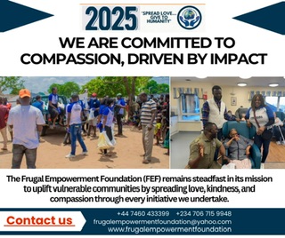 As we journey through 2025, the Frugal Empowerment Foundation (FEF) remains committed to empowering lives, uplifting communities, and spreading hope across Nigeria, the UK, and beyond. With our theme “Spread Love… Give to Humanity,” we are set to expand our impact through: