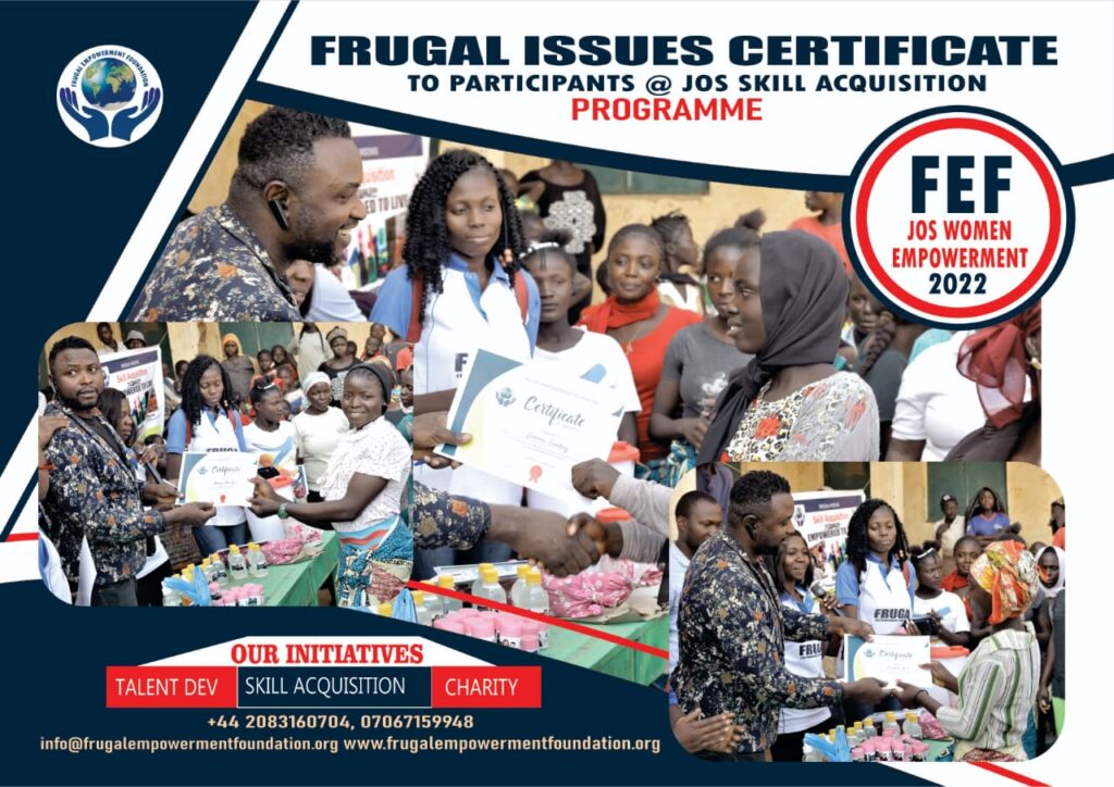 As we continued to strengthen our efforts to support the less privileged community, Frugal Foundation in 2022 successfully empowered 200 widows at Bassa Local Government of Plateau State. The founder of the organisation, Mr Frugal, during the awards ceremony held on 19th November 2022, praised the widows for their determination to take part in the skill acquisition programme which featured training on Liquid Soap, disinfectant and Petroleum Jelly making.