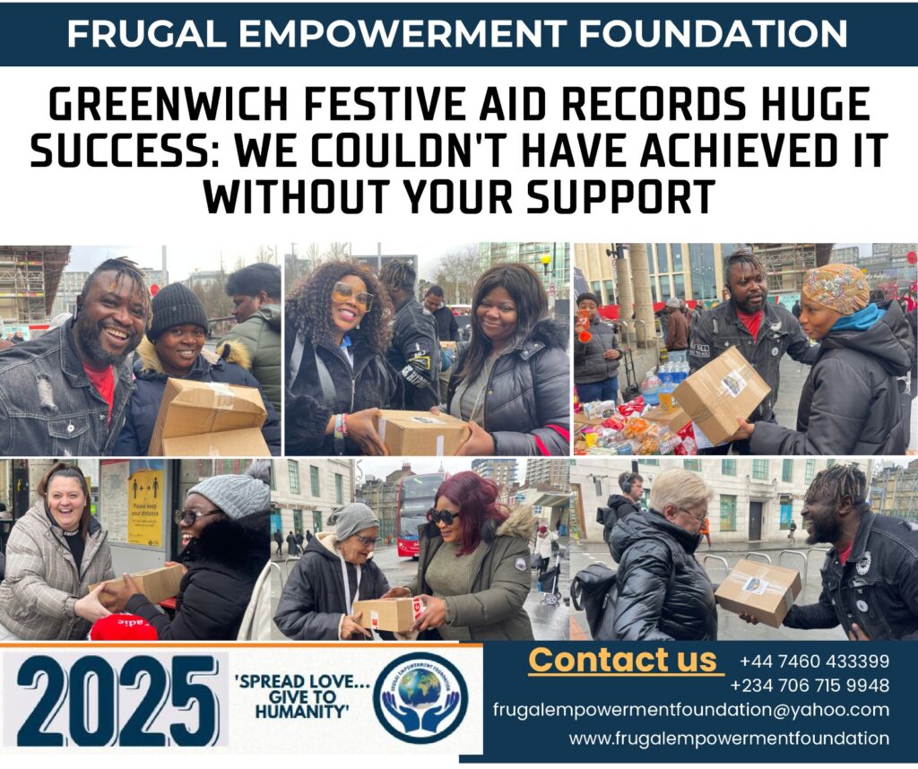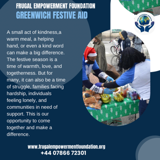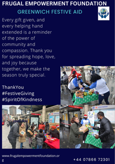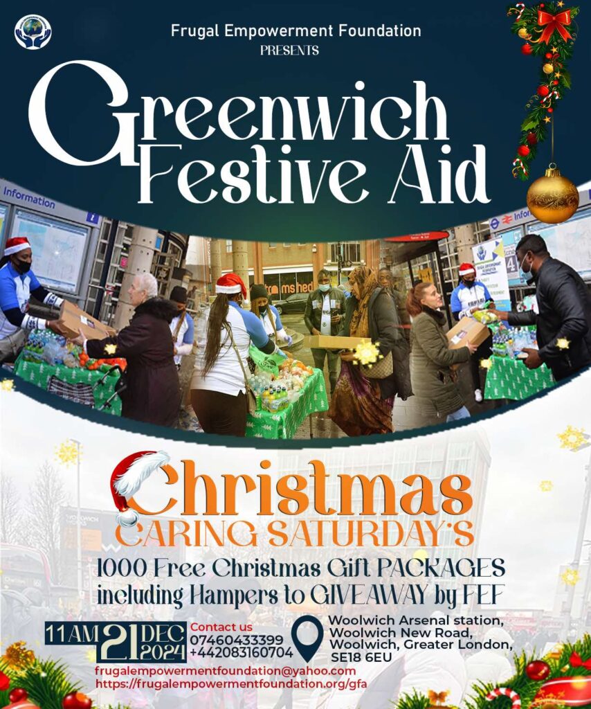 I hope this message finds you well. As the festive season approaches, the Frugal Empowerment Foundation is delighted to announce our major charity event, “Greenwich Festive Aid on “Caring Saturday’s Christmas Edition,” taking place on 23rd December 2023.